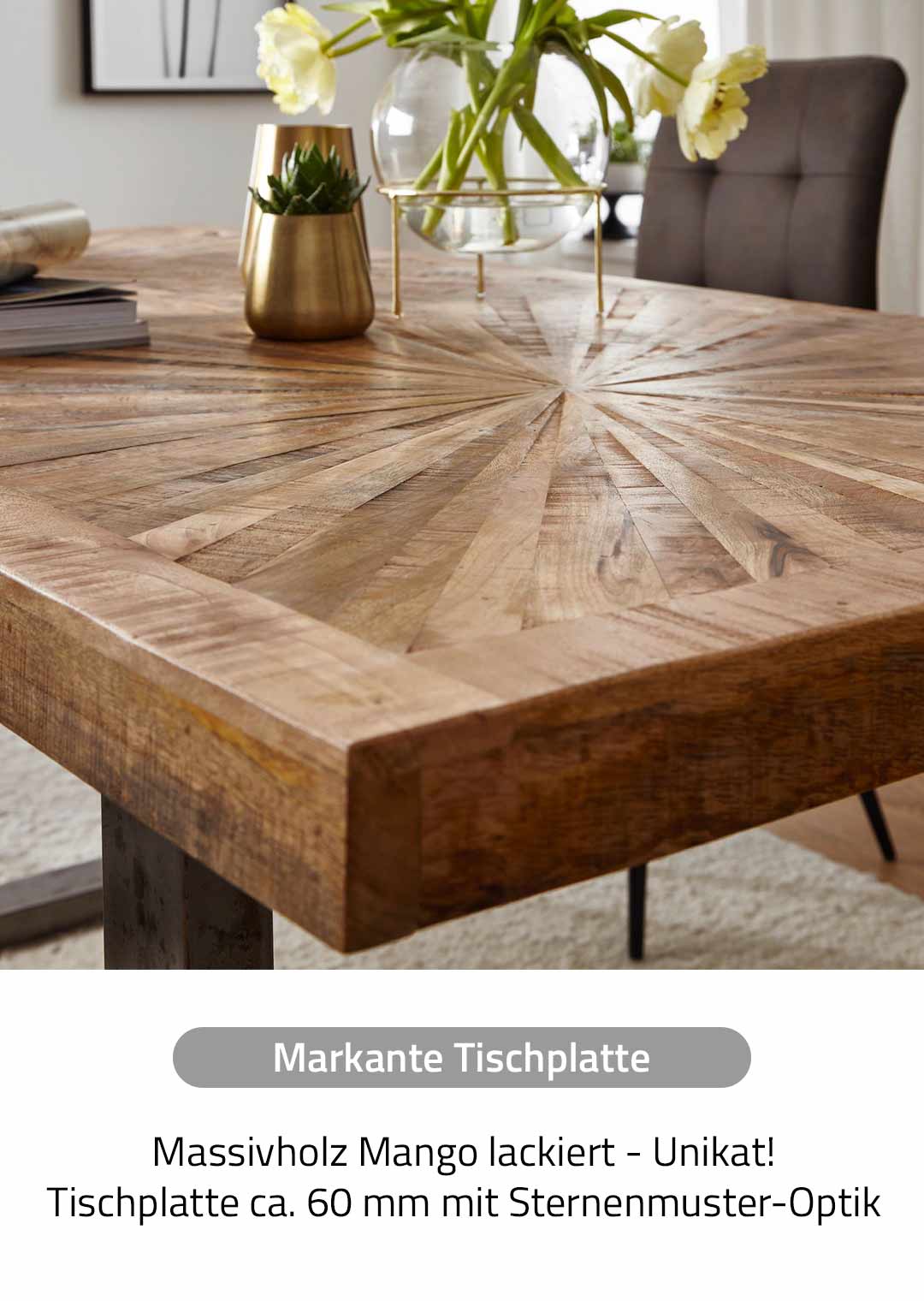 Der Esstisch MARETH besticht durch seine ausdrucksstarke Tischplatte aus massivem Mango-Holz. Die aufwendig gearbeitete Oberfläche mit dekorativem Sternmuster verleiht dem Tisch eine besondere, lebendige Optik und bringt die natürliche Maserung des Holzes perfekt zur Geltung. Ein harmonischer Kontrast entsteht durch die Kombination mit dem U-Gestell aus Metall, welcher sich in viele Wohnstile einfügen lässt - von modern über industriell bis hin zu rustikal.