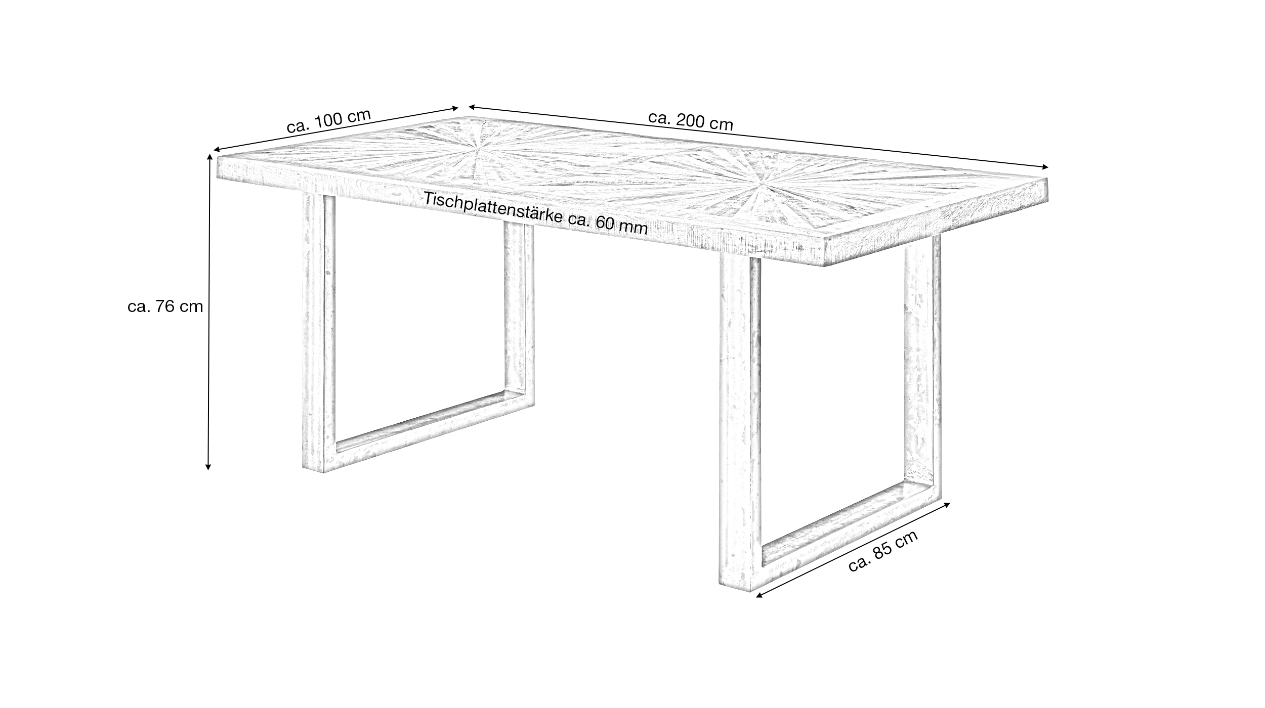 Mit seinen großzügigen Maßen von ca. 200 cm Breite und ca. 100 cm Tiefe bietet der Tisch Platz für mehrere Personen, wodurch geselligen Abenden mit Freunden und Familie nichts im Wege steht. Die durchdachte Konstruktion ermöglicht zudem viel Beinfreiheit und sorgt für hohen Sitzkomfort im täglichen Gebrauch. Die Tischplattenstärke von ca. 60 mm verleiht dem Esstisch MARETH sowohl eine hohe Belastbarkeit wie auch einen ganz besonderen Stil.