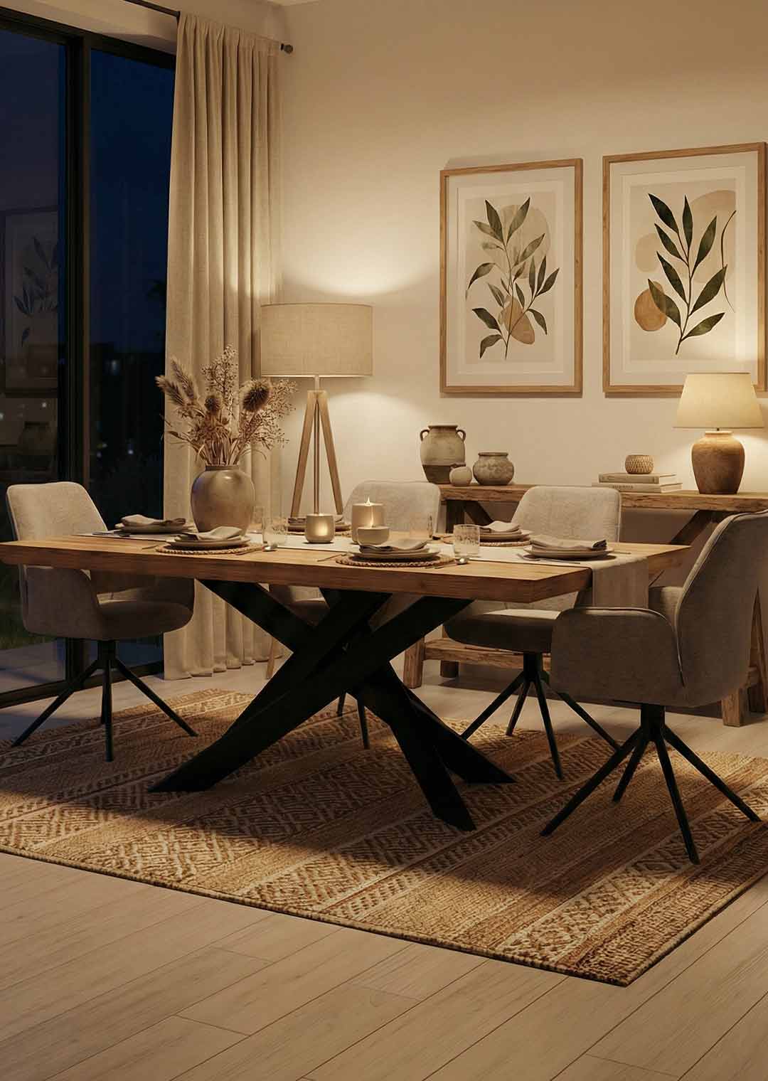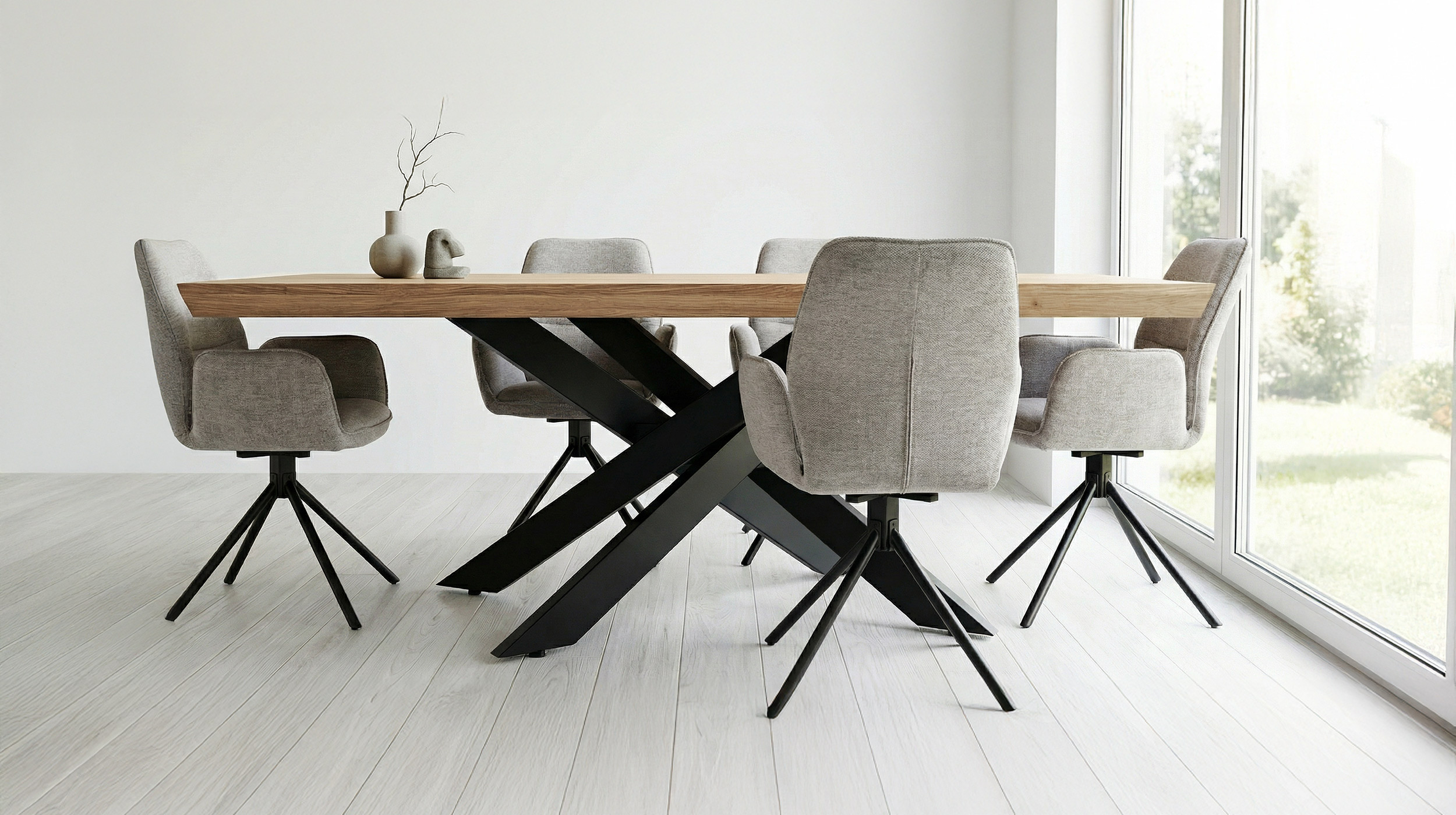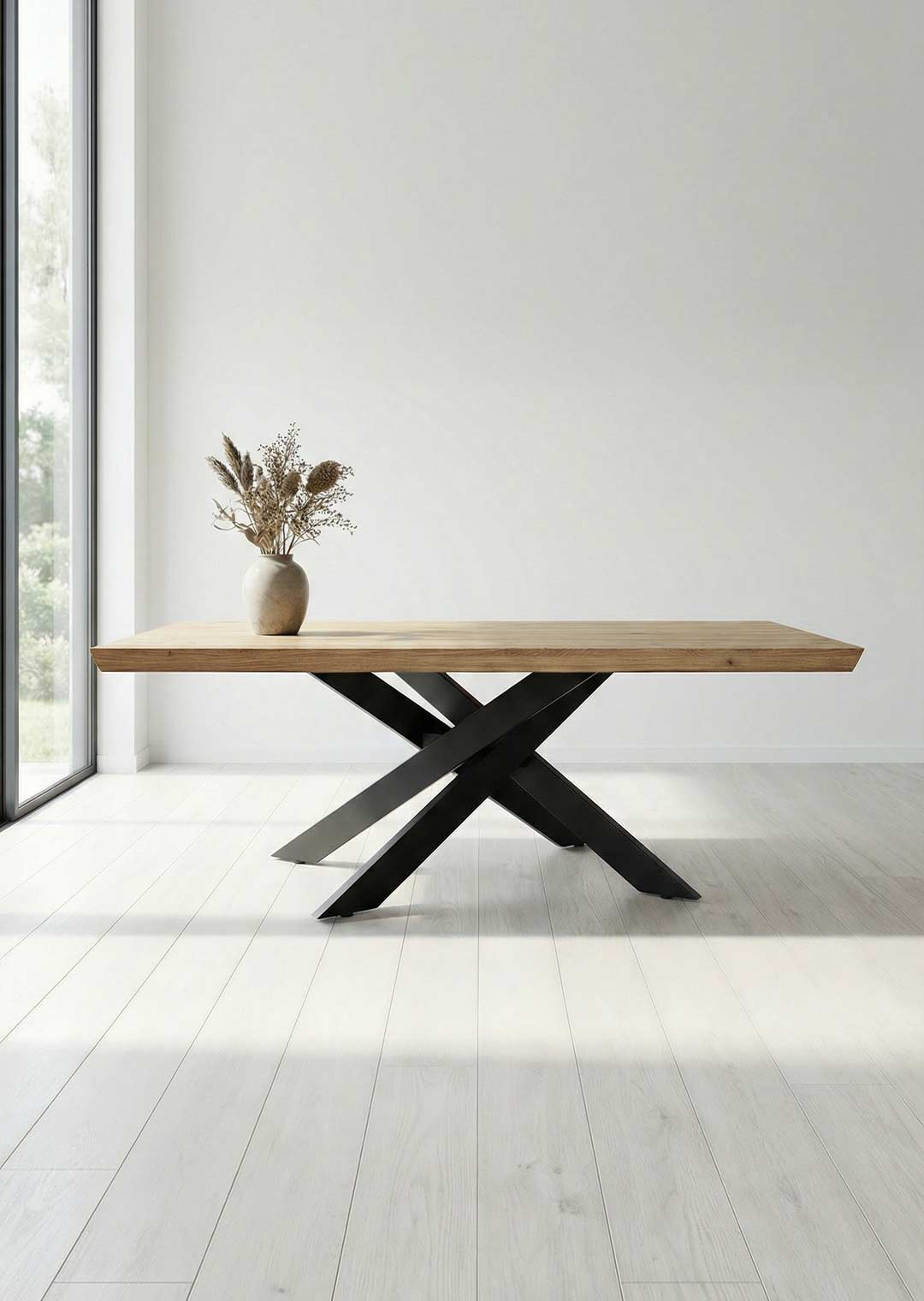 Der Esstisch AHUS vereint handwerkliche Qualität mit zeitgemäßer Formensprache und schafft so einen harmonischen Mittelpunkt für jedes Esszimmer. Die massive, geölte Wildeiche verleiht dem Tisch eine warme, natürliche Ausstrahlung, während die Schweizer Kante - eine elegant abgeschrägte Formgebung der Tischplatte - für Leichtigkeit und eine dynamische Silhouette sorgt. Die markante insgesamt ca. 60 mm starke Tischplatte hat eine durchgehende Plattenstärke von ca. 20 mm und einen zusätzlichen aufgedoppelten Rahmen von ca. 40 mm. Das schwarze Mikado-Gestell aus pulverbeschichtetem Metall bildet dazu einen spannenden Kontrast. Die Tischbeine kreuzen sich in der Mitte zu einem filigranen, spannenden Design mit dynamischer Optik, die den Tisch leichter wirken lässt und gleichzeitig Stabilität bietet. Das Zusammenspiel von natürlichen Materialien und modernen Akzenten macht AHUS zu einem Esstisch, der Charakter und Stilbewusstsein ausstrahlt.