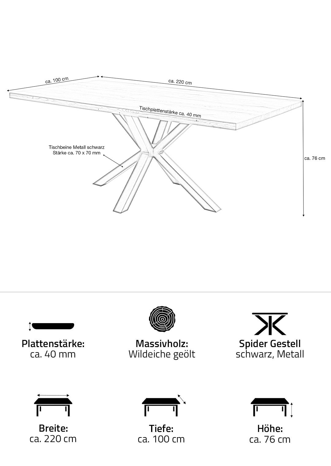 Esstisch 220 cm - Wildeiche geölt Spider-Gestell - DEBA
