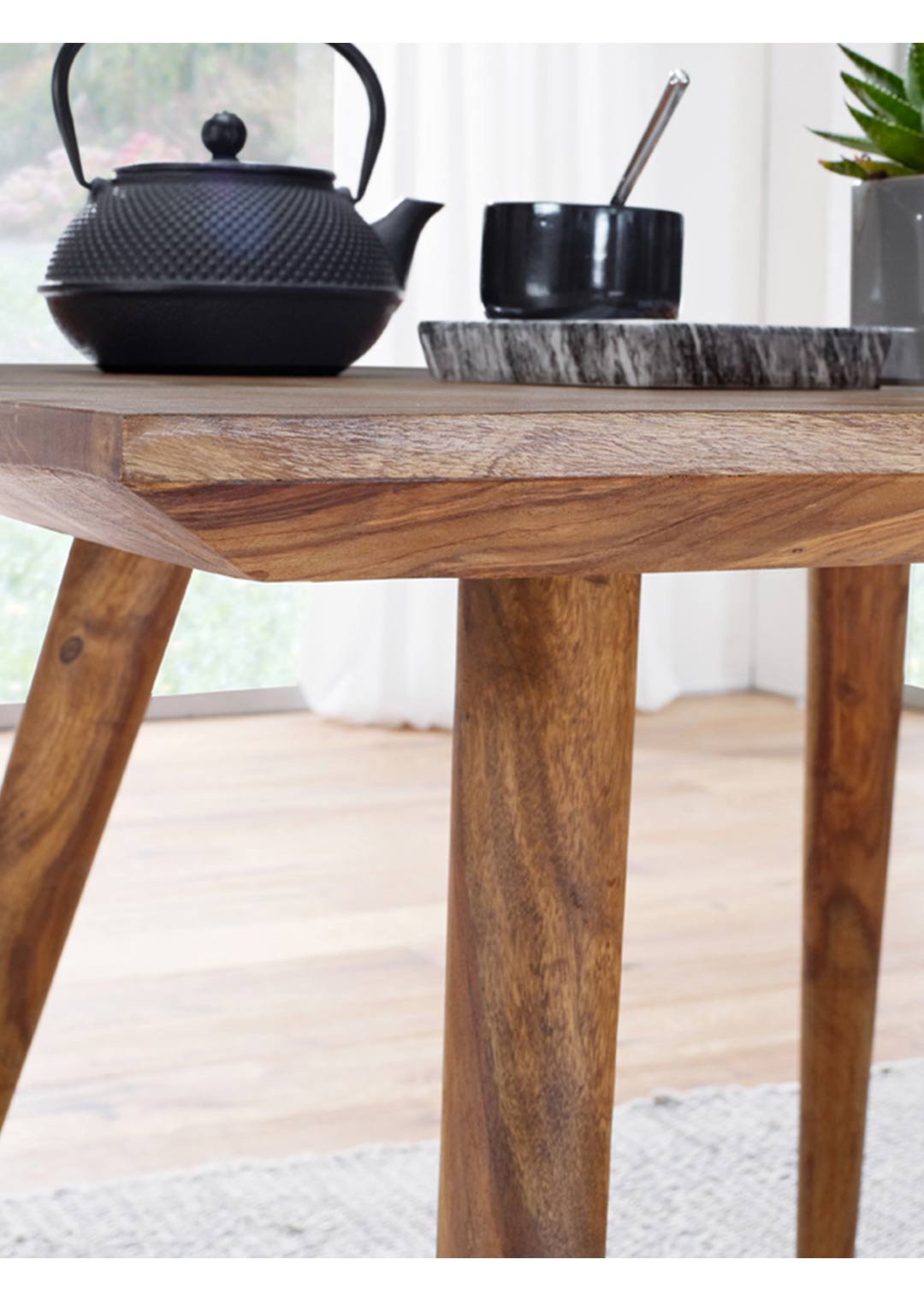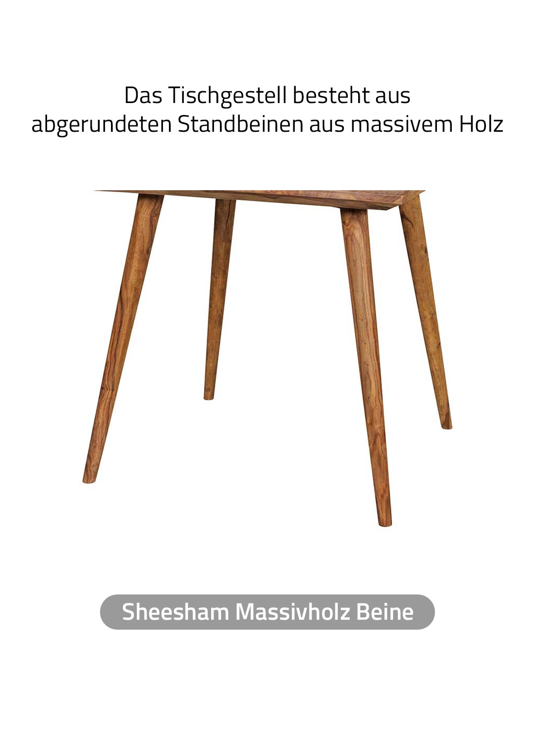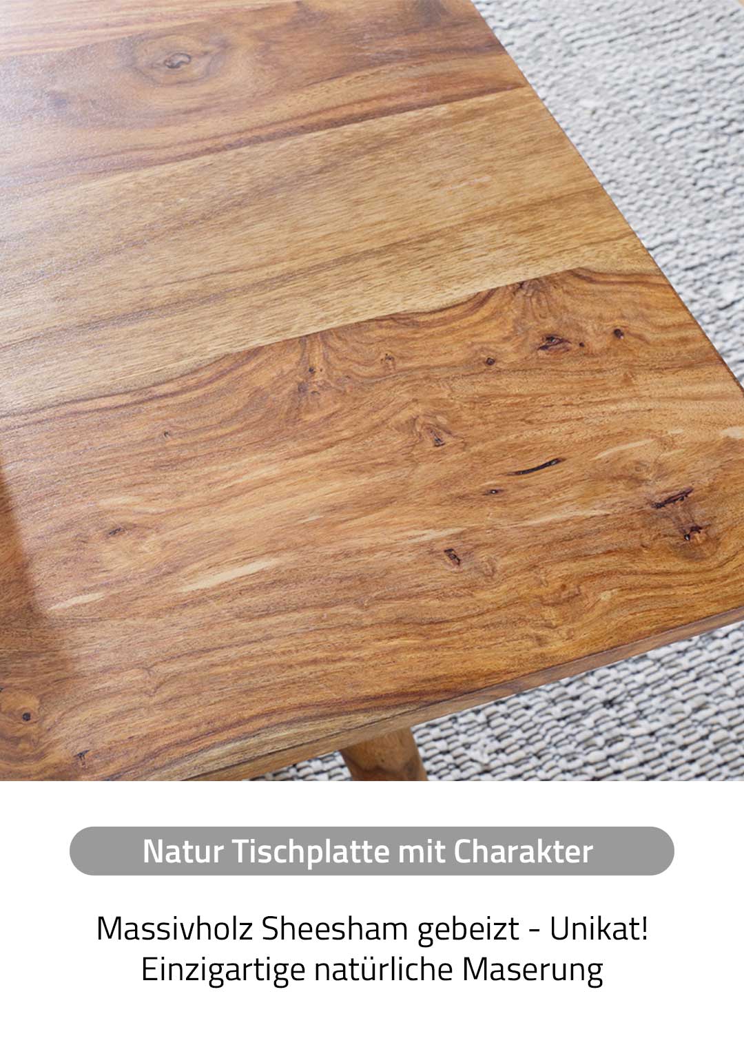 Sheesham Holz: Das Sheeshamholz zeigt eine charaktervolle Maserung mit abwechslungsreichen Farbtönen, die jedem Exemplar seine individuelle Note verleihen. Durch die Beize wird die natürliche Holzstruktur betont, während die Oberfläche ihren warmen, authentischen Charakter behält. Sheesham punktet durch seine natürliche Härte und Langlebigkeit, wodurch der Tisch ideal für den täglichen Gebrauch geeignet ist. Da es sich um ein reines Naturprodukt handelt, ist jeder Esstisch ein Unikat: Astlöcher, feine Risse, natürliche Fugen, Farbnuancen oder leichte Unebenheiten sind keine Mängel, sondern typische Merkmale von Echtholz, die den authentischen Charakter und die Einzigartigkeit jedes Exemplars unterstreichen.