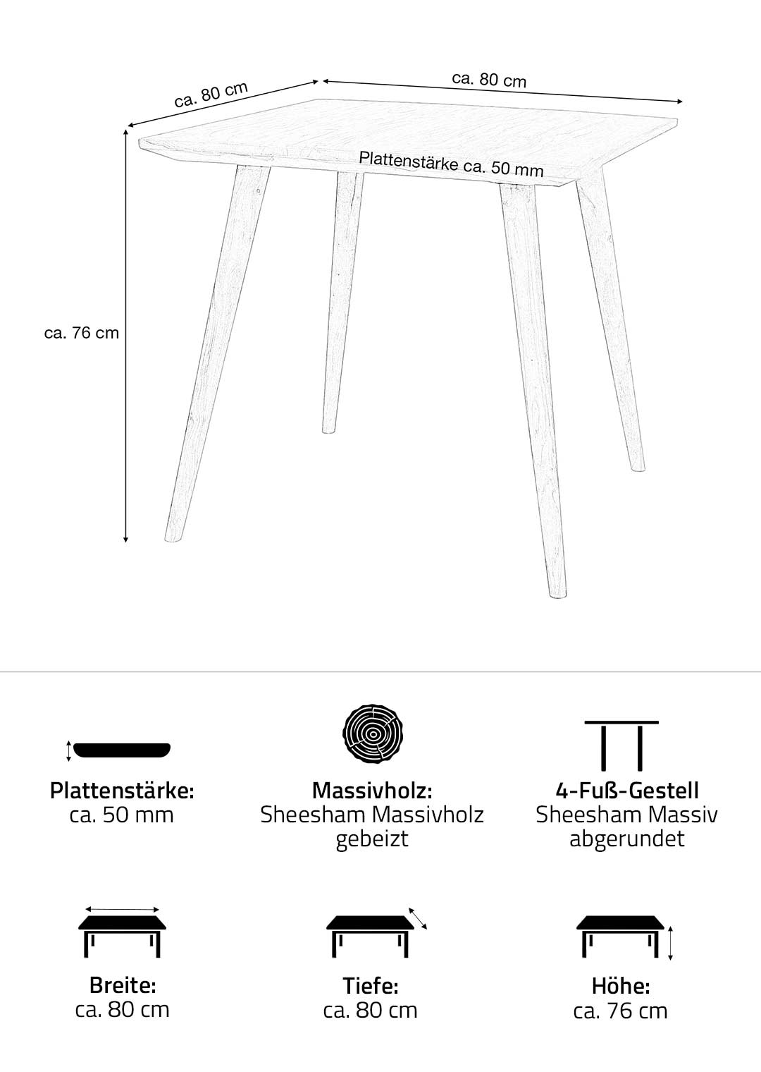 Die Schutzlackversiegelung bewahrt das Holz vor alltäglichen Beanspruchungen und erleichtert die Pflege, sodass es besonders langlebig bleibt. Mit seinen kompakten Maßen von ca. 80 × 80 cm und einer Höhe von 76 cm eignet sich der Tisch ideal für kleinere Essbereiche oder Küchen, bietet aber dennoch ausreichend Platz für gemeinsame Mahlzeiten und ein gemütliches Beisammensein mit 2 - 4 Personen. Dank seiner stabilen Konstruktion und des zeitlosen Designs eignet sich der Tisch ebenso hervorragend als Frühstückstisch in belebten Küchen.