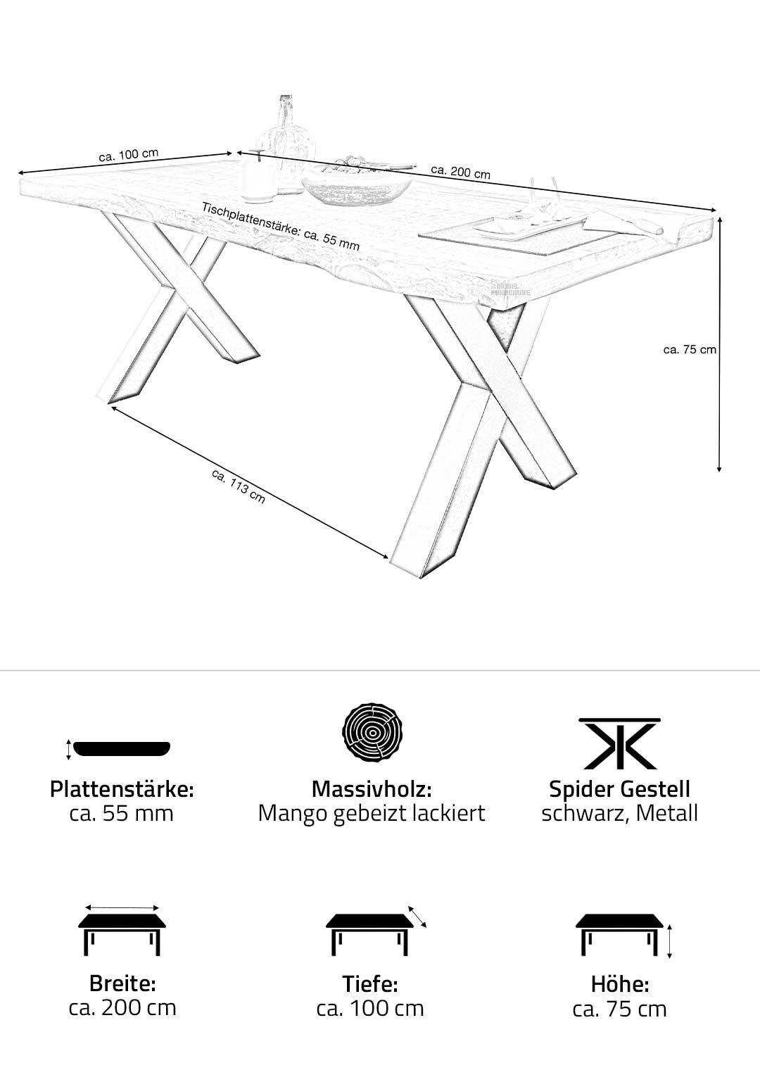 Der Esstisch TOMASO besteht aus massivem, gebeiztem und lackiertem Mangoholz, dessen lebendige Maserung und Farbverläufe jeden Tisch zu einem unverwechselbaren Einzelstück machen. Die natürlich gewachsene Baumkante ist direkt aus dem Stamm geschnitten und hebt die Authentizität des Holzes besonders hervor. Das X-förmige Metallgestell in Schwarz sorgt nicht nur für Stabilität, sondern bringt auch eine moderne Note ins Design. Charakteristisch für den Tisch sind mögliche Astlöcher, kleine Risse und Unregelmäßigkeiten – sie sind keine Mängel, sondern Ausdruck der Individualität.