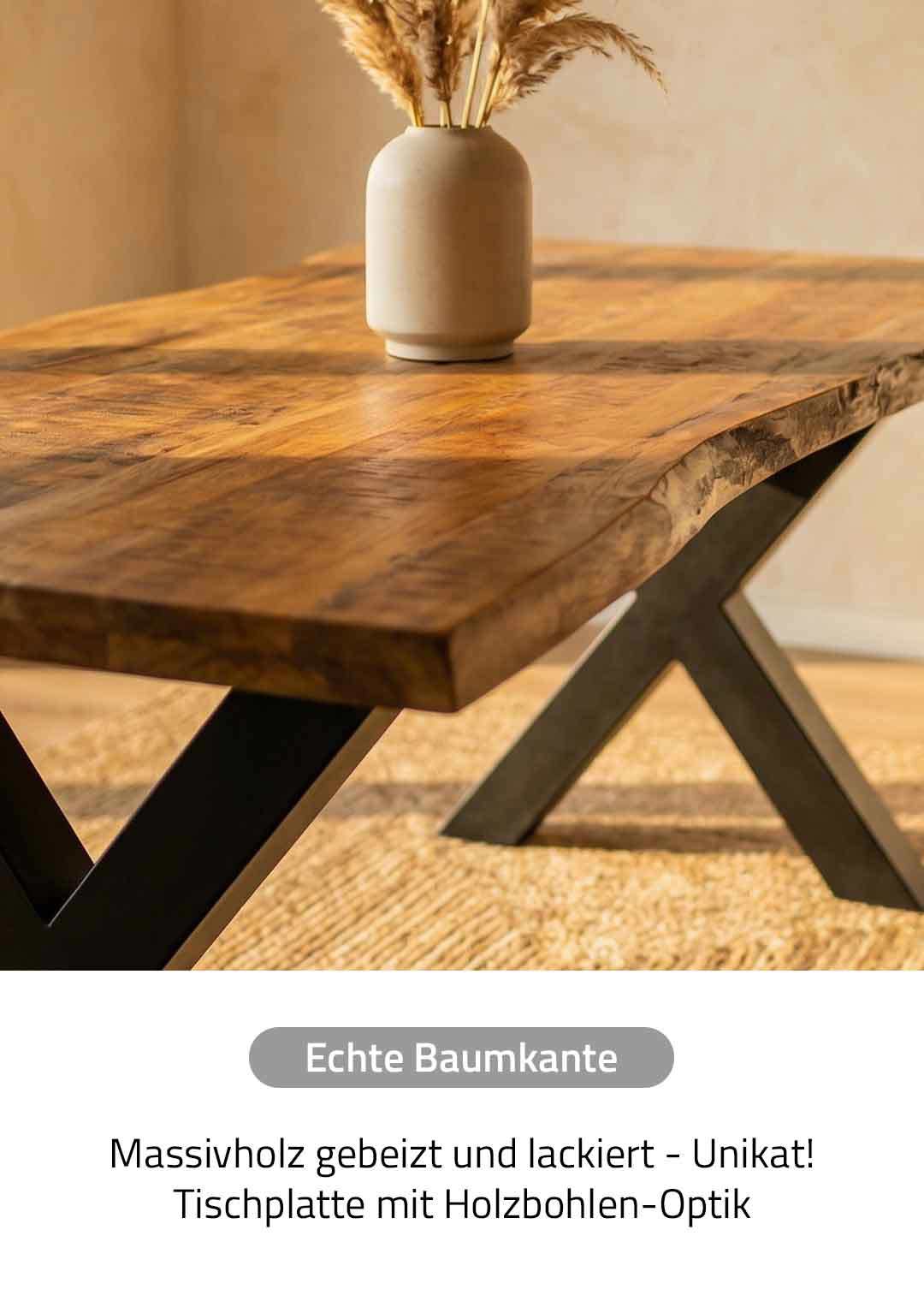 | Eigenschaften | Tischbeine X-Form, echte Baumkante, Naturprodukt mit natürlichen Farbabweichungen und Unebenheiten |