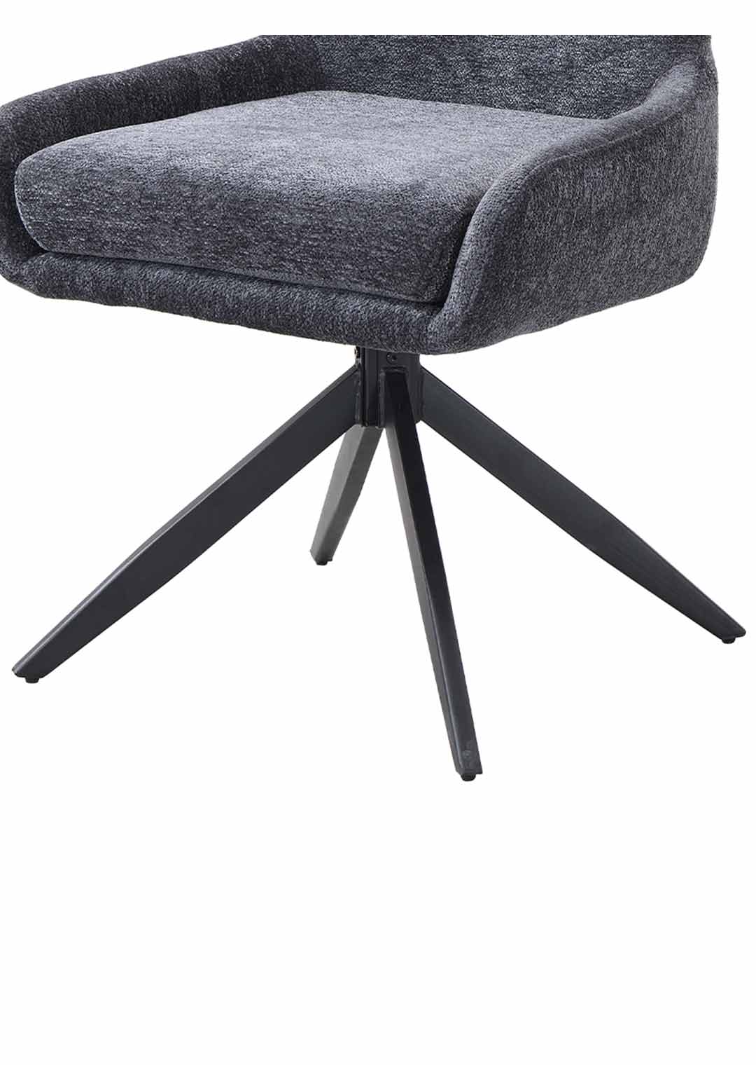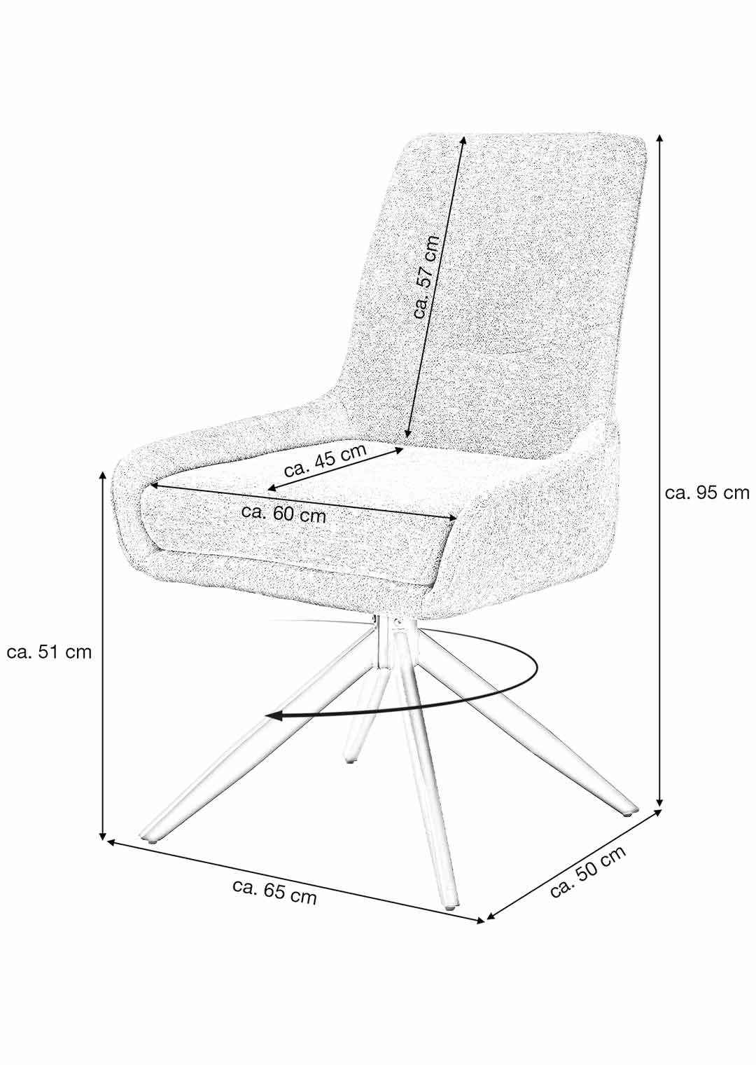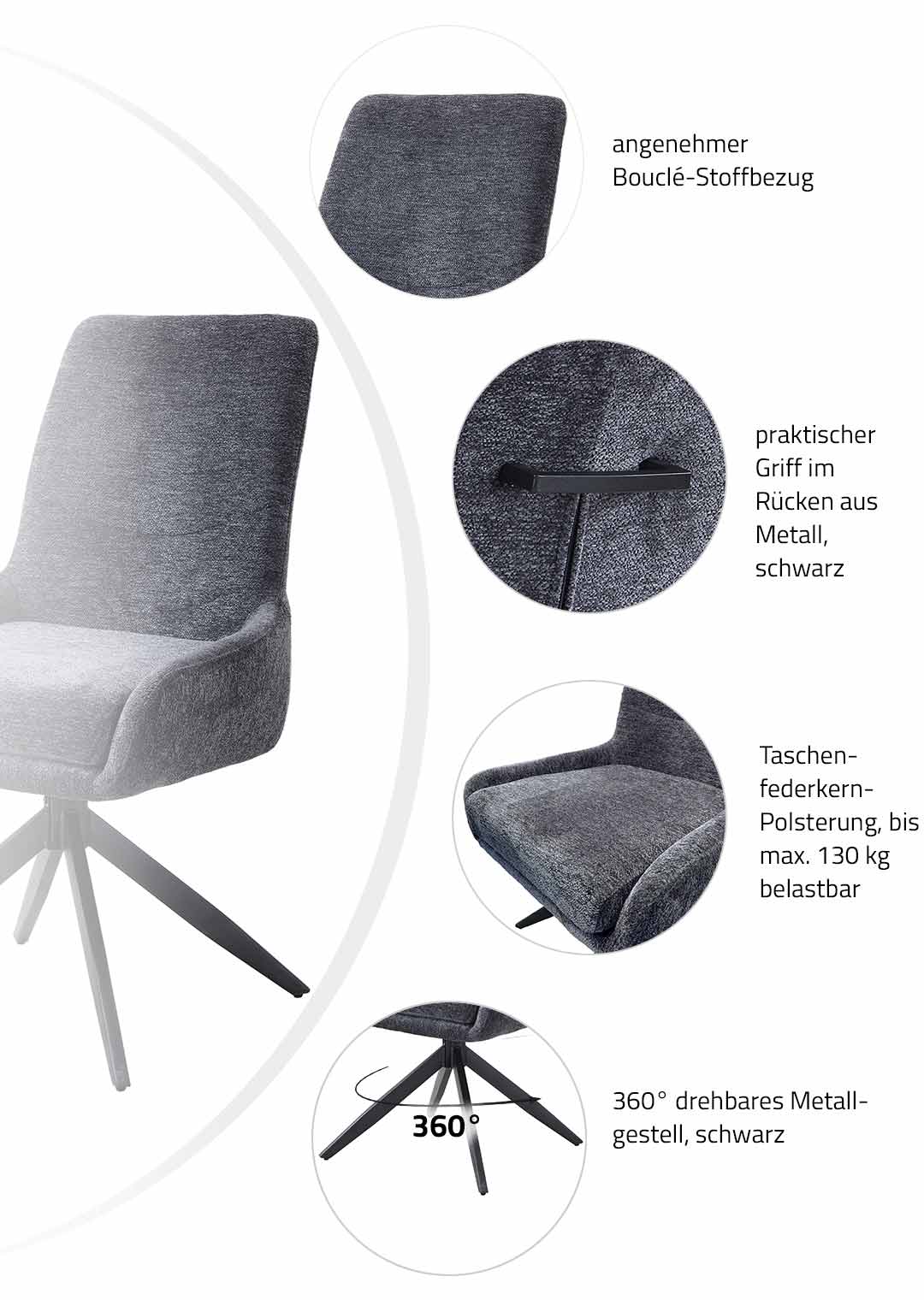 Eine trendbewusste Wahl für Ihr Esszimmer - unser Polsterstuhl JANA! Unser komfortabler Esszimmerstuhl JANA bereichert Ihr Zuhause um einen Eyecatcher in zeitgenössischer Optik in Anthrazit, wodurch ein stilvolles Ambiente geschaffen wird. Kombinieren Sie Ihn elegant zu modern gestalteten Tischen oder als dekorativen Stuhl für einen skandinavischen Touch. Der trendige Bezug in Bouclé-Stoff verzaubert mit seiner texturierten und anschmiegsamen Haptik. Bouclé-Stoff begeistert dank einer einzigartigen Oberflächenoptik, die durch ihre kunstvoll gewebten Schlingen einen einladenden Charme und zeitlose Raffinesse verströmt. Abgerundet wird die formschöne Gestaltung des Drehstuhls mit einem stabilen Metallgestell in schwarz und der angedeuteten Sitzschale. Mit der verarbeiteten Taschenfederkern-Polsterung wird ein optimales Komforterlebnis geschaffen, perfekt für ausgedehnten Spieleabenden und Abendessen mit den Liebsten. Die hochwertige Polsterung passt sich dabei angenehm an den Körper an und bietet gleichmäßige Unterstützung für eine ideale Körperhaltung. Der Esszimmerstuhl verfügt über eine praktische 360° Grad Drehfunktion, so können Sie sich Ihren Sitznachbarn zudrehen und dem Gespräch entspannt folgen. Ein Metallgriff an der Rückenlehne ermöglicht müheloses Drehen und Anheben um die Positionierung um Ihren Tisch zu vereinfachen. Genießen Sie langanhaltenden Komfort und lehnen Sie sich entspannt zurück. Bestellen Sie jetzt Ihren neuen Polsterstuhl direkt online in unserem Shop oder besuchen Sie uns in einer unserer Filiale vor Ort.Wir freuen uns auf Sie!| Produktdetails: | |