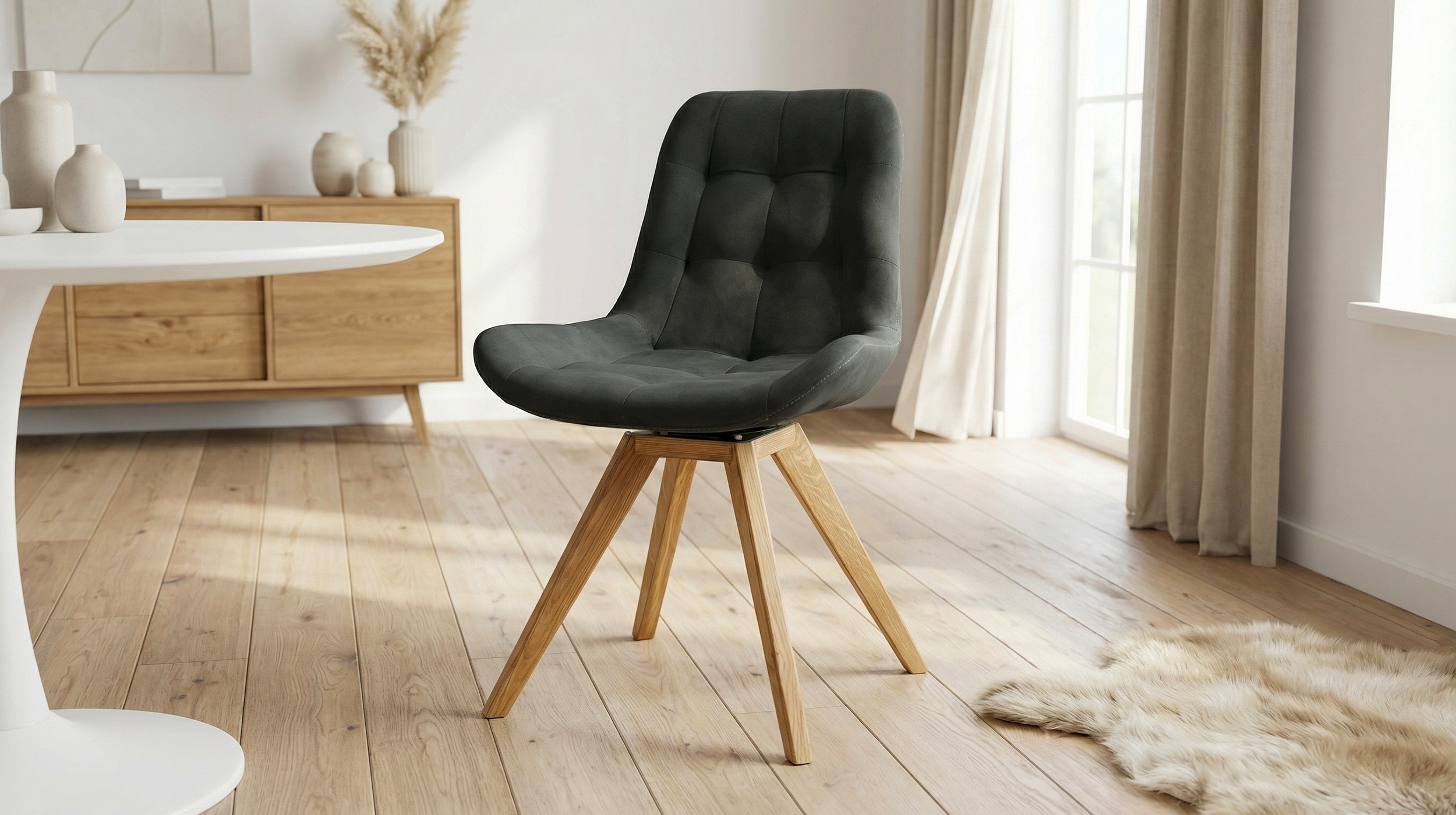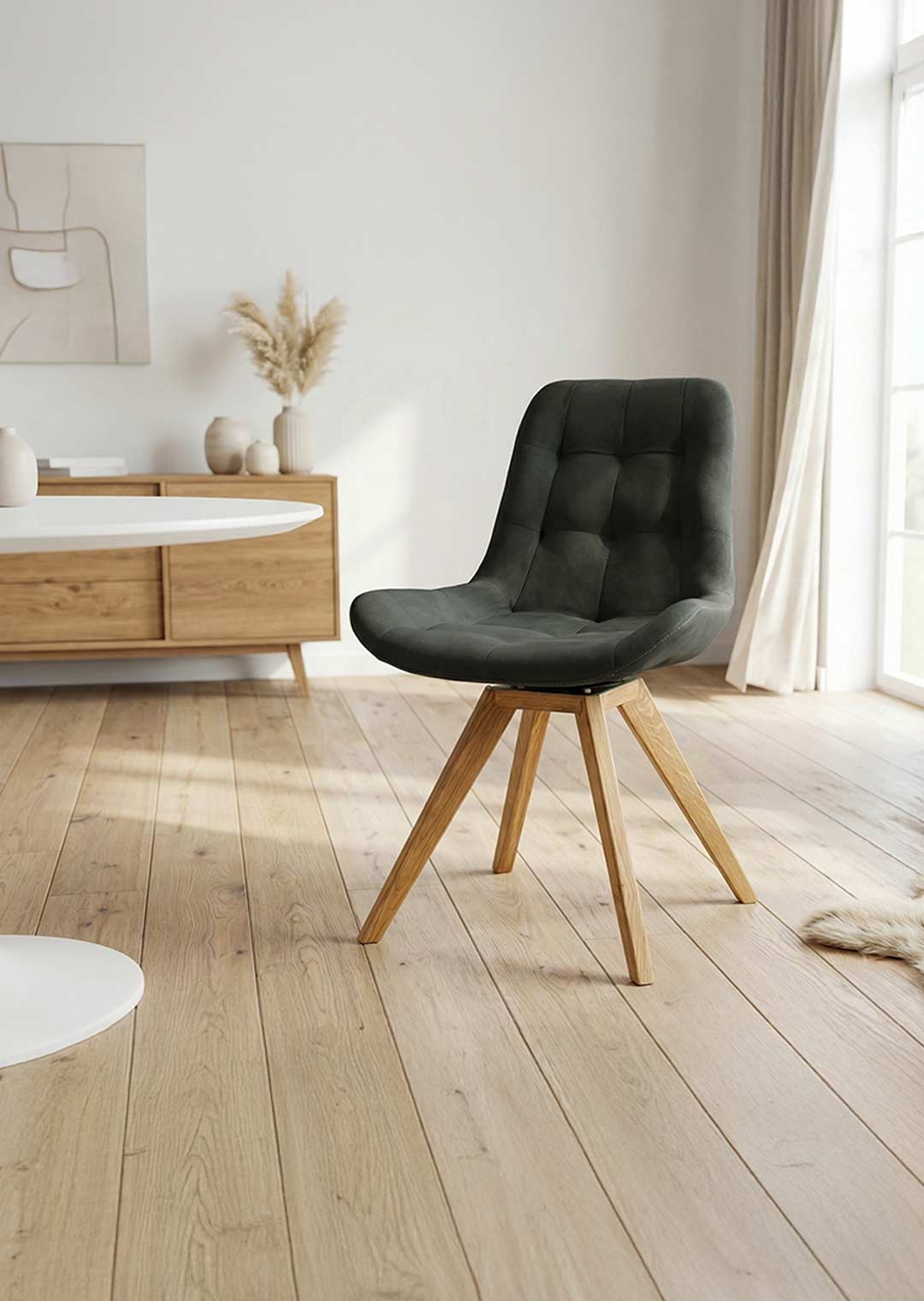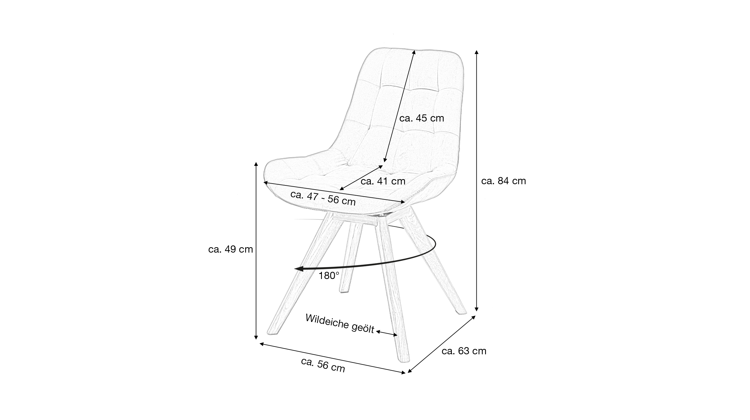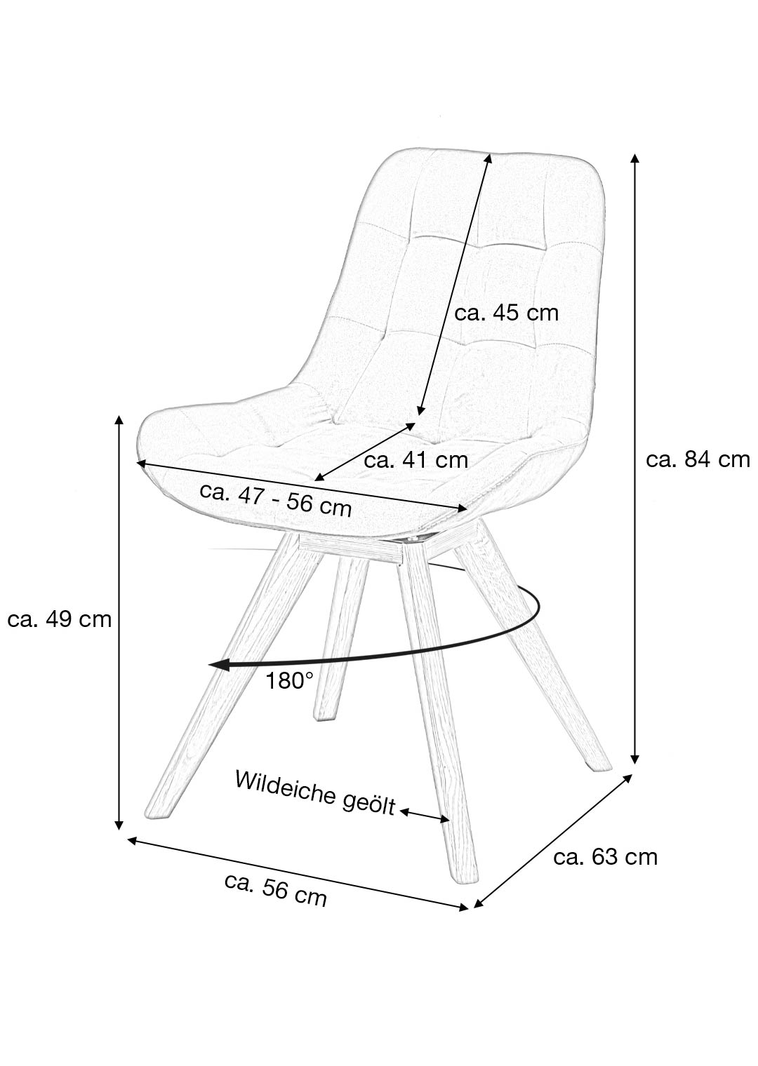 BELFAST ist aber auch ein durchdachter Begleiter für Ihren Alltag. 4 konisch zulaufende Standbeine aus massiver, geölter Wildeiche sorgen für einen stabilen Stand. Massivholz ist ein robustes und langlebiges Material, welches darüber hinaus eine lange Nutzungsdauer ermöglicht. Die charakteristische, natürliche Holzmaserung macht dabei jedes Exemplar zu einem Unikat. Dank der gepolsterten Sitzschale ermöglicht der Stuhl ein bequemes Sitzen bei einer Sitzhöhe von ca. 49 cm - sei es beim Abendessen, beim Lesen oder während konzentrierter Arbeit. Zusätzlichen Komfort und Bewegungsfreiheit garantiert die um 180° drehbare Sitzfläche. Ob im Esszimmer, im Homeoffice oder in der Lounge - dieser Stuhl passt in Ihr Zuhause.