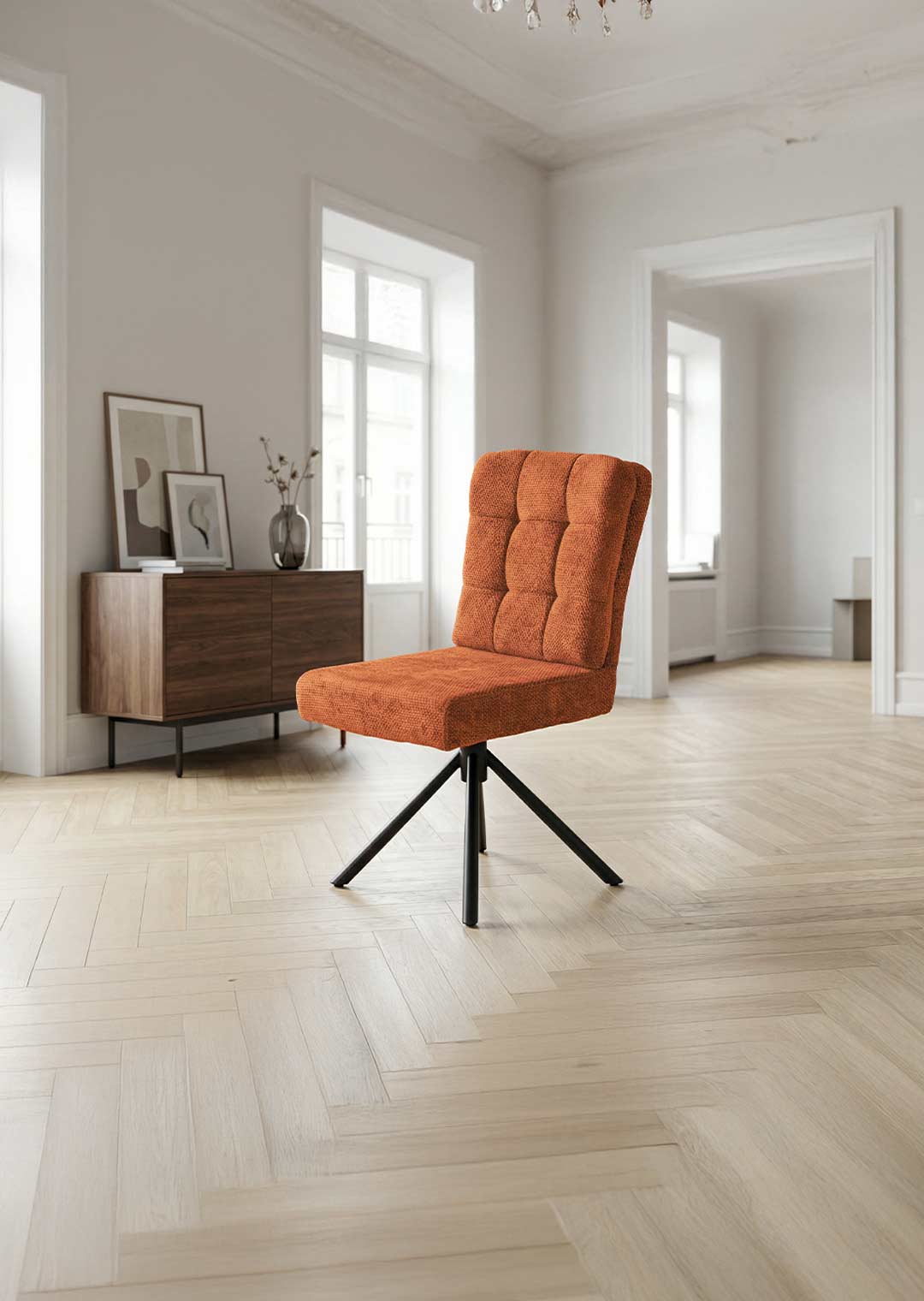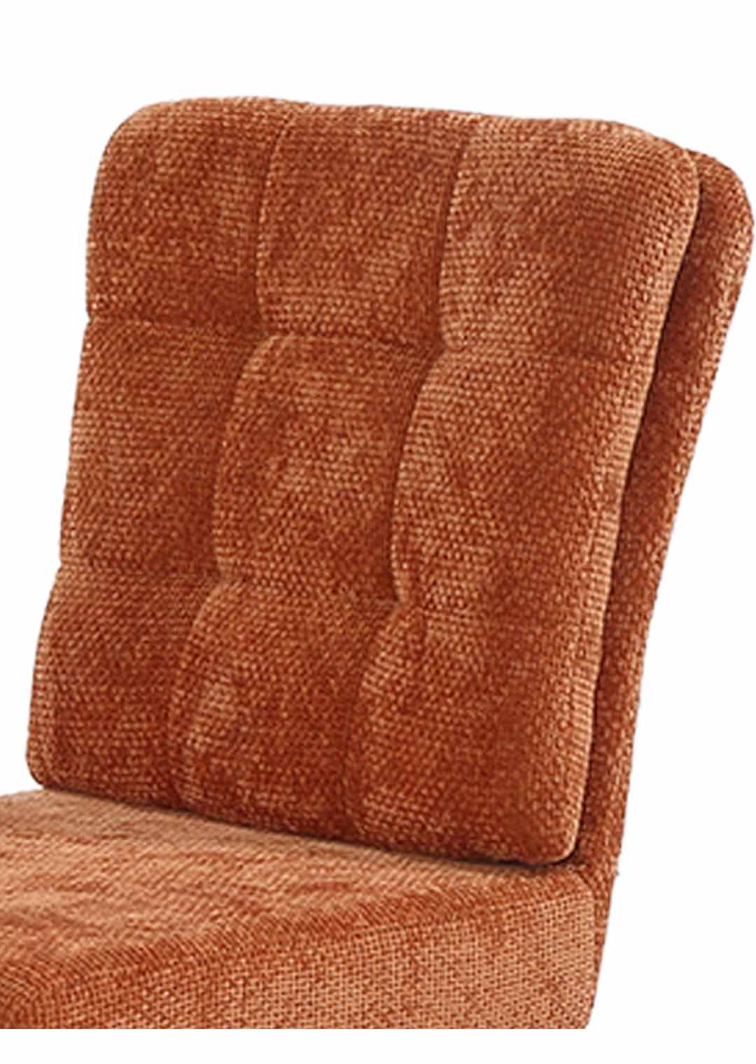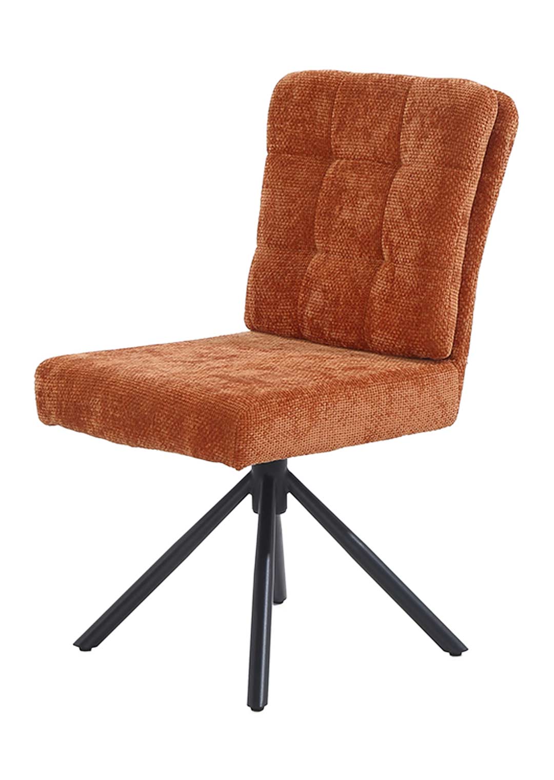 Unser Polsterstuhl HEDIA erscheint in einem hochwertigen Chenille-Bezug in Orange. Dieser überzeugt durch seine besonders weiche Haptik und lädt zum Verweilen ein. Die Rückenlehne ist mit einem fest vernähten, aufgesetzten Kissen versehen, das dem Stuhl eine besondere Gemütlichkeit verleiht. Die auffällige Steppung im Kissen betont diese Gemütlichkeit noch zusätzlich. Für einen festen Stand im Alltag sorgt das pulverbeschichtete 4-Fuß-Gestell aus Metall in mattem Schwarz. Es verleiht dem Gesamtbild dieses Esszimmerstuhls eine ruhige, moderne Optik, sodass er sich harmonisch in klassische, wie zeitgemäße Einrichtungsstile einfügt.