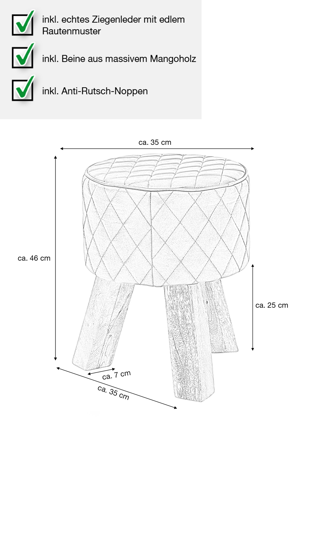| Bestandteile | Sitzfläche Echtes Ziegenleder, Füße aus massivem Mangoholz lackiert |