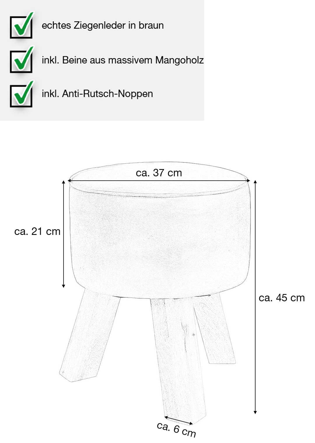 | Bestandteile | gepolsterte Sitzfläche aus echtem Ziegenleder in braun, Füße aus massivem Mangoholz lackiert |